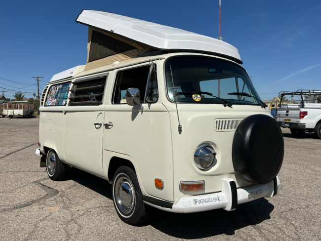This 1971 Volkswagen Type 2 is a pop-top camper that is powered by a replacement 1.6-liter flat-four mated to a four-speed manual transaxle. The van is said to have spent…