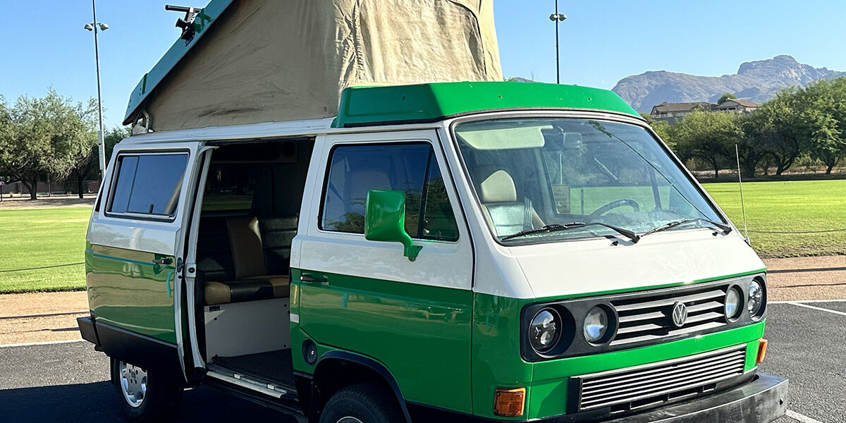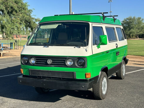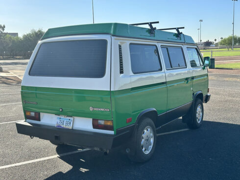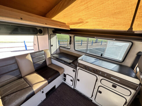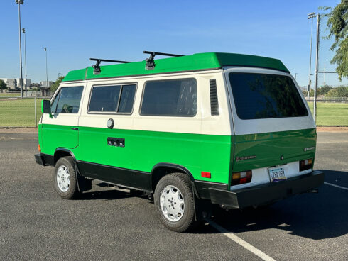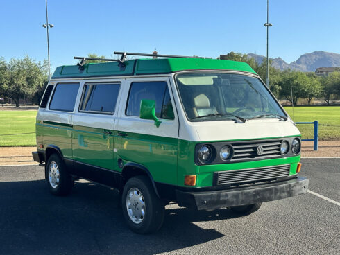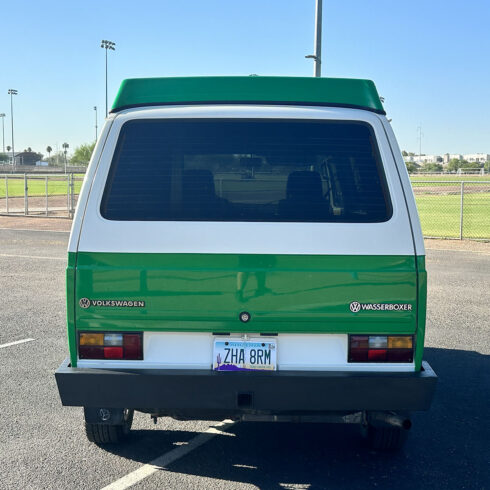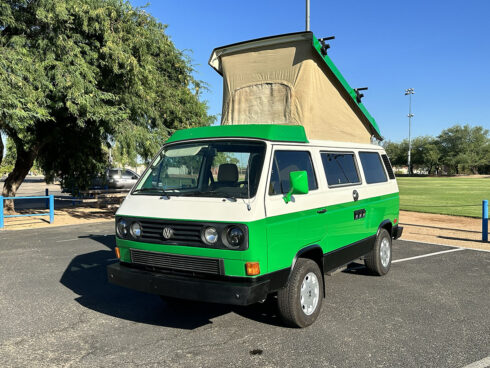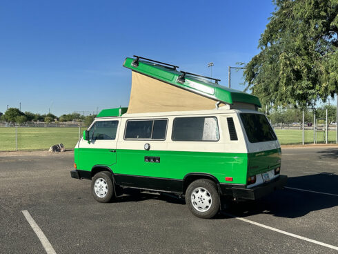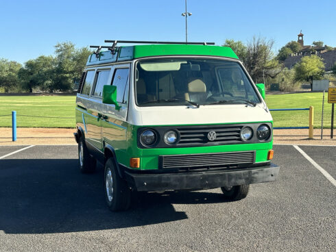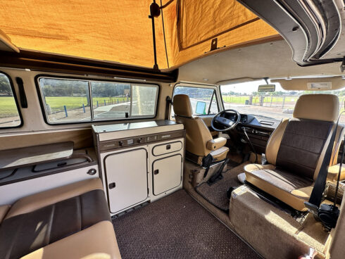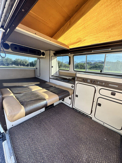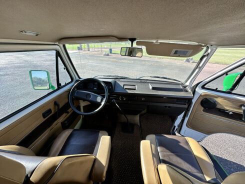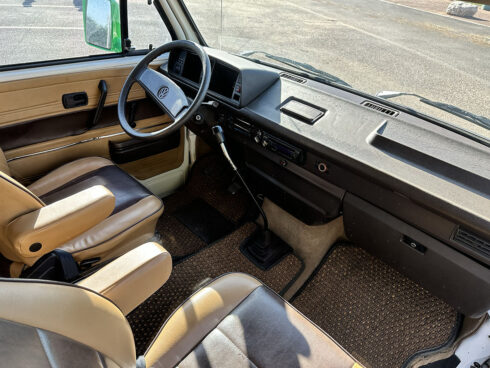 This 1985 Westfalia is powered by the 1.9 Vanagon waterboxer and 4 speed manual transmission. It sits on brand new GoWesty 15” rims and new Yokohama Geolander tires. The upholstery was professionally redone by the previous owner, sporting two-tone brown vinyl seats and bed pad. The Westfalia equipment is all intact. The two burner stove, fridge, and cabinetry is in fantastic shape and ready to use. The pop top has a single forward-facing zipper window, free of rips or tears. Both front seats swivel 180* for more comfort when camping. The nose is equipped with the South African grill inset with Bosch fog lamps. Both bumpers have been replaced with the GoWesty off-road bumpers. This is a road trip queen ready for camping.